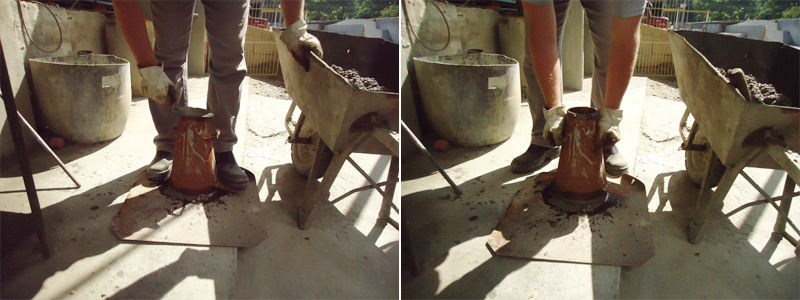 Após o término da compactação da última camada, retira-se o funil e alisa-se o topo do molde. A retirada do molde deve ser feita com velocidade constante, sem movimentos de torção lateral nem movimentos bruscos.
