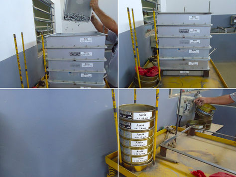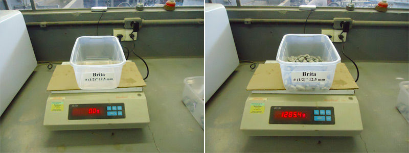 Para este ensaio mede-se 200 pedras, de acordo com a granulometria, obtendo a maior e a menor dimensão. Após o término do ensaio os valores são digitados e o valor final calculado por fórmulas.